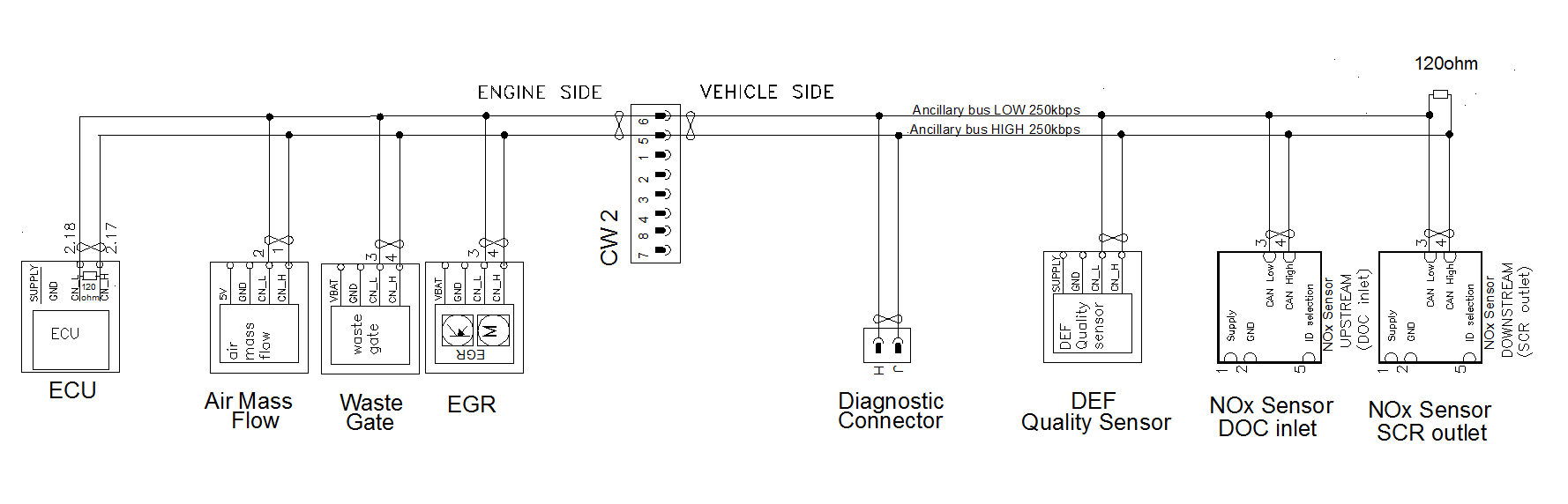 The diagnostic connector is located in the ancillary CAN bus, and the connector is in accordance with the SAE 1939 standard.CAN 1 / CAN B Private bus 1Mbps