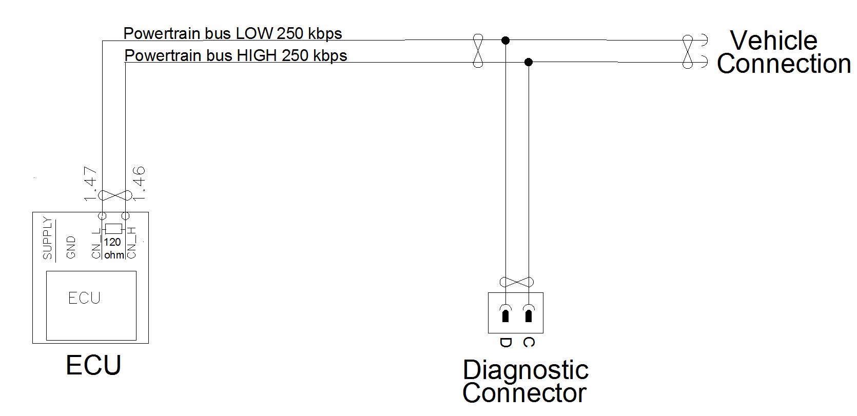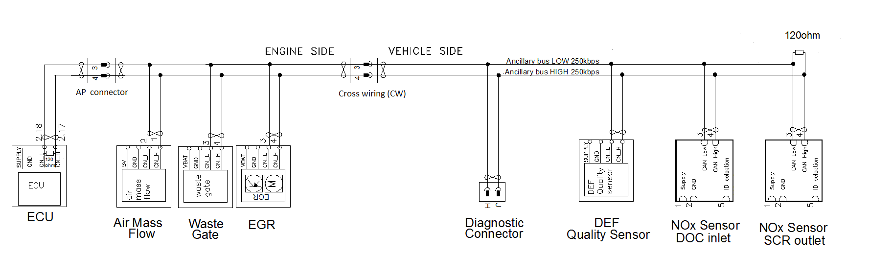 The diagnostic connector is located in the ancillary CAN bus, and the connector is in accordance with the SAE 1939 standard.CAN 0 / CAN A Powertrain bus 250kbps