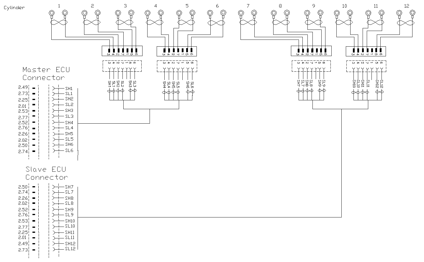 The injector harness for the 12-cyl engine is shown in figure 12-cyl Injector harness.