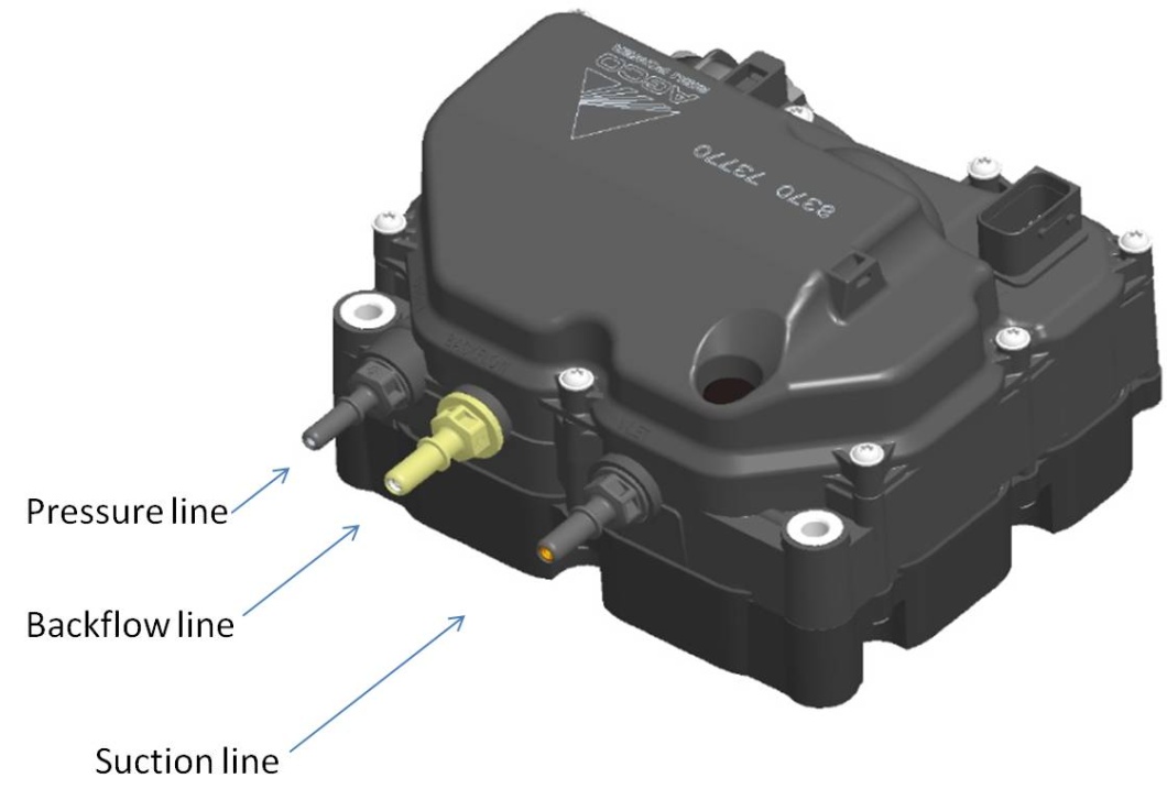 The supply module is a part of the vehicle SCR system. The supply module is a hydraulic unit which sucks the reducing agent (DEF/AdBlue) from the tank, pressurizes it ( approx. 8-10 bars) and delivers it to the dosing module which is fixed to the exhaust line. The supply module is controlled via the engine ECU.