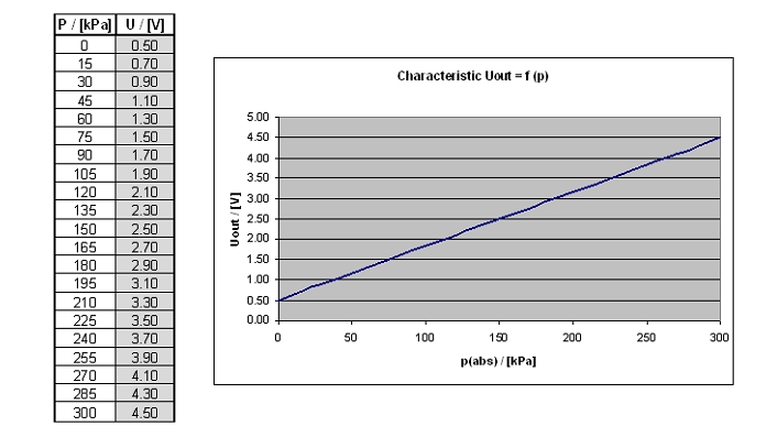 At 100 kpa abs (~atmospheric pressure) = 1.9 V At 300 kpa abs = 4.5 V