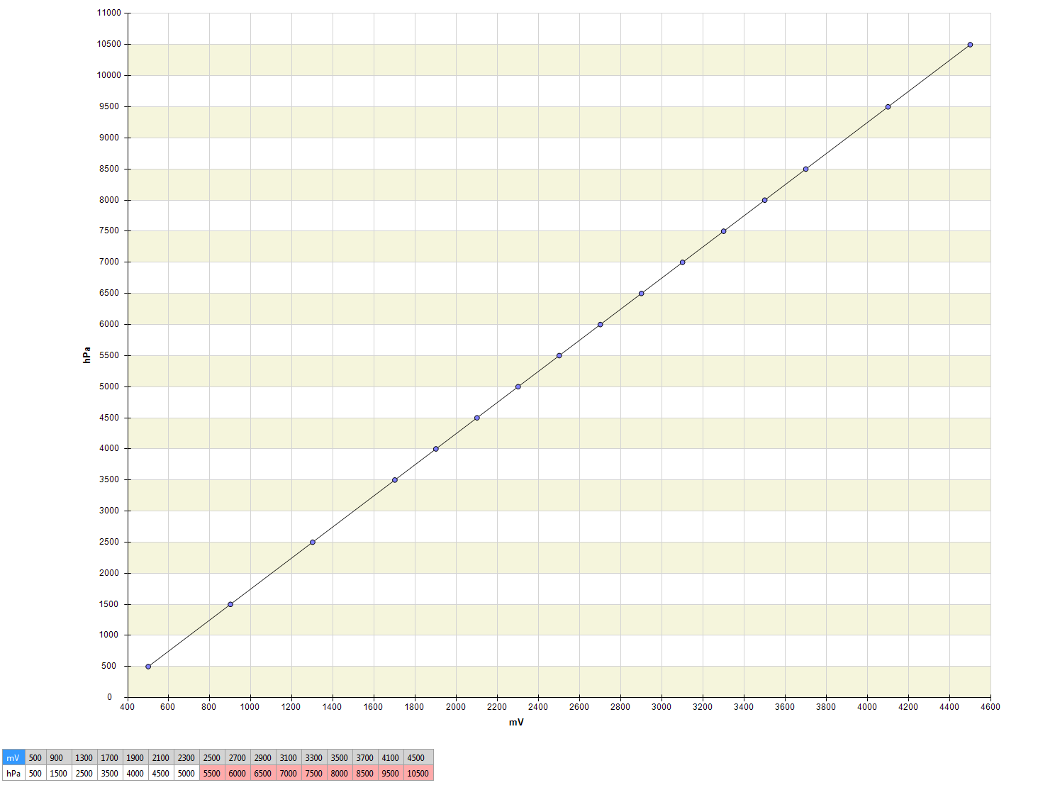 At 100 kPa abs (~atmospheric pressure) = 0.5 V At 1100 kPa abs = 4.5 VNominal resistance (temperature):