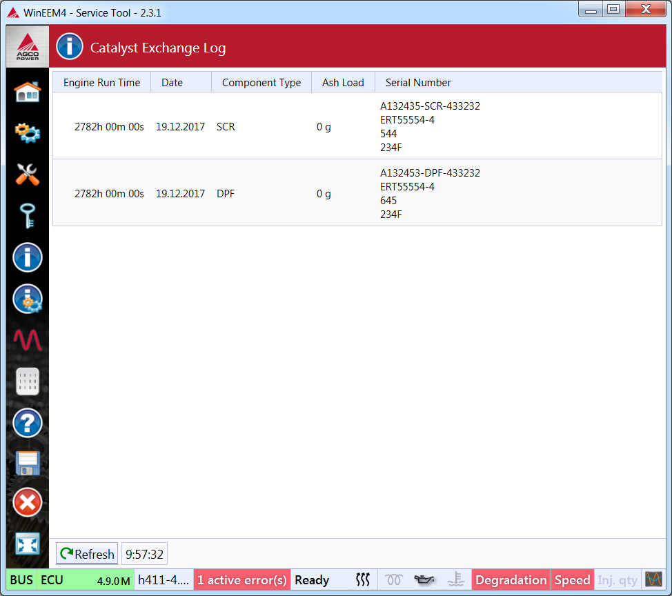 Catalyst exchange log displays the DPF and SCR exchange history. Each log entry displays e.g. the serial number of the new exchanged component.