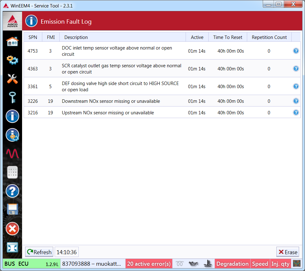 Some of the fault codes are emission related and the emission log provides additional information of these faults. The SPN, the FMI, and the description columns identify the fault. The Active column shows how long the fault has been active. The Time to reset column shows for how long the fault has to be inactive in order to completely be diagnosed as inactive. The Repetition count column shows how many times the fault has been active.