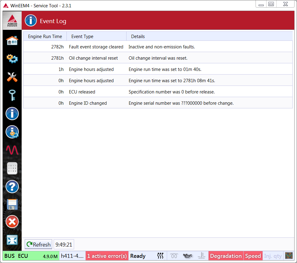 See sections SCR event log and DPF event log for SCR and DPF event log descriptions.
