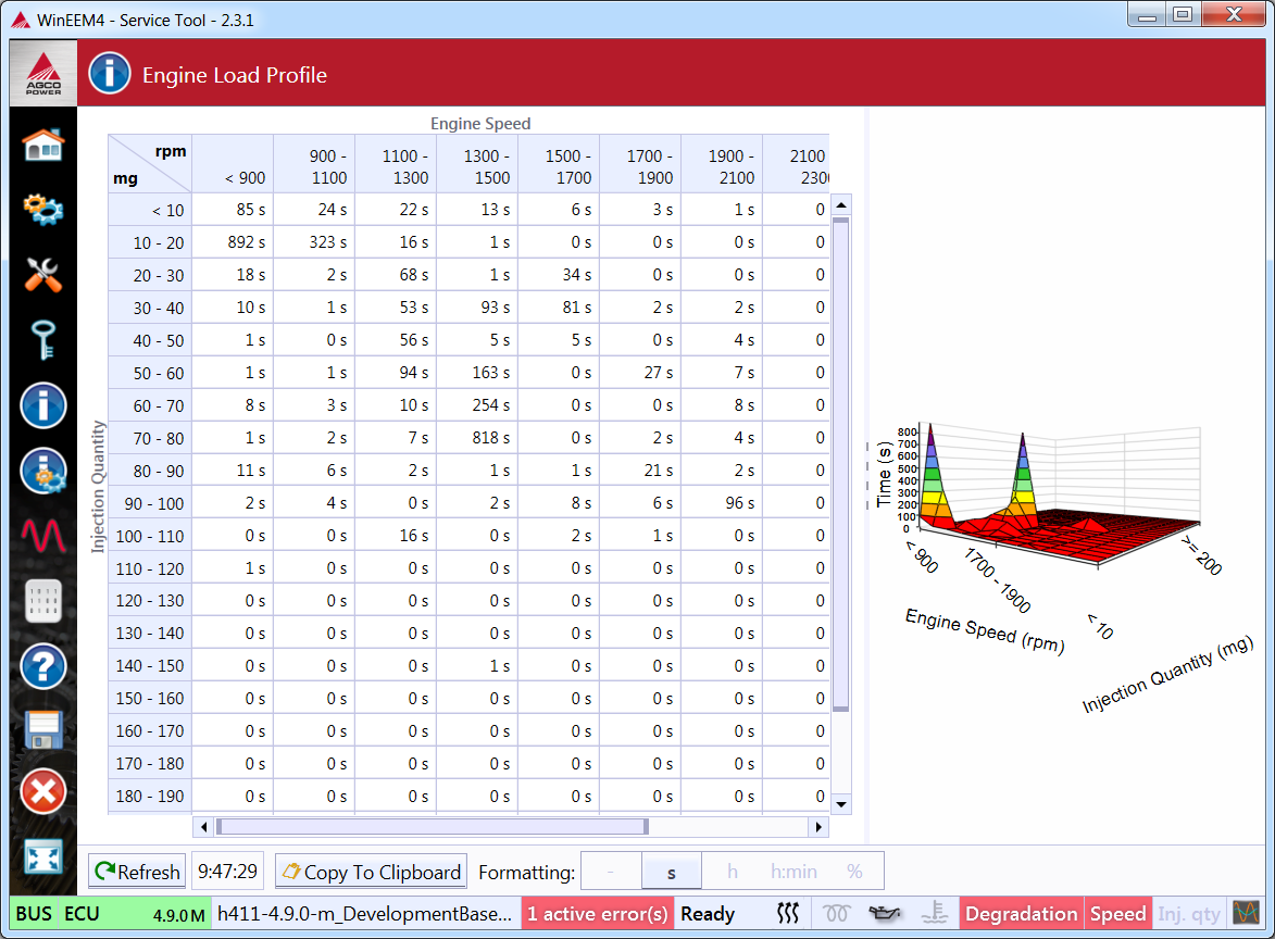 The Engine load profile shows statistic information of how the engine has been loaded during its lifetime. The X-axis is the engine rpm, and Y-axis is the fuel injection quantity. Each cell in the table shows the time for how long the engine has been at that operating point. The time unit can be selected from seconds, hours, hours and minutes, and the percentage of the total running hours.