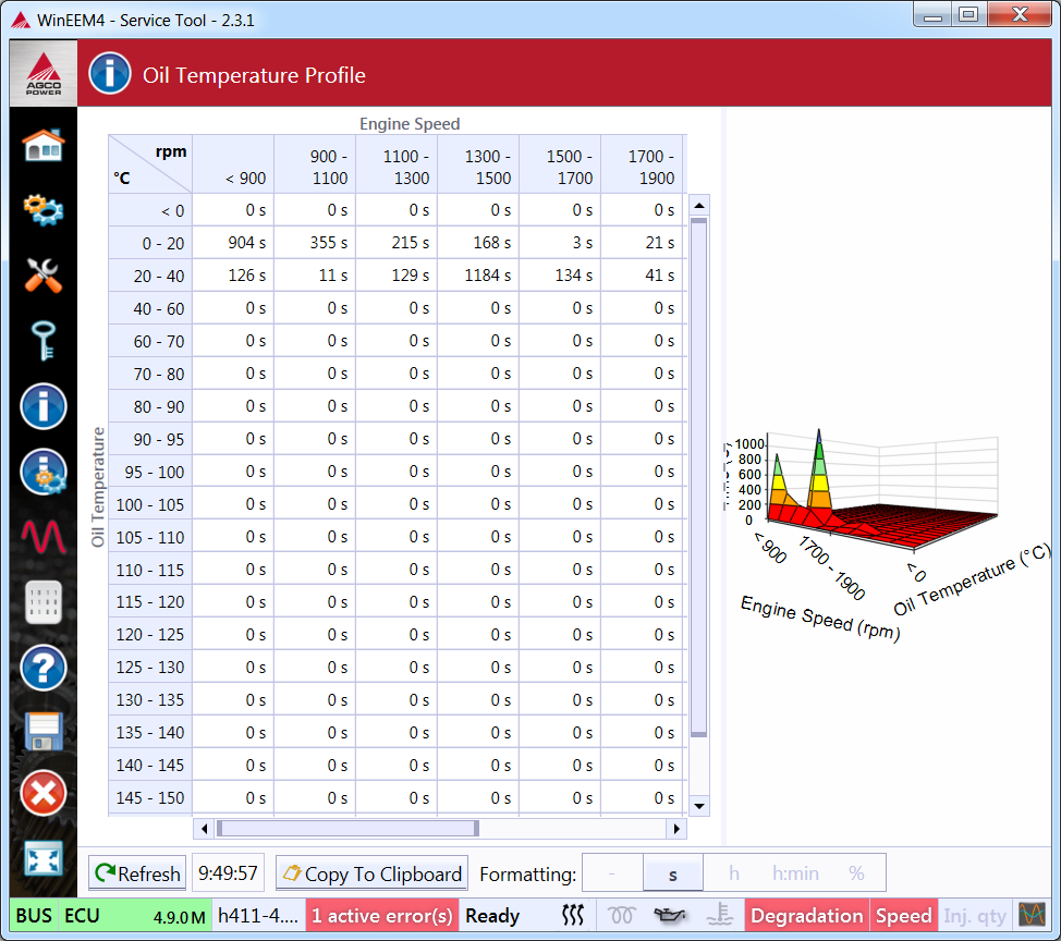 Oil temperature profile displays how much time has been spent in each oil temperature & engine speed range.