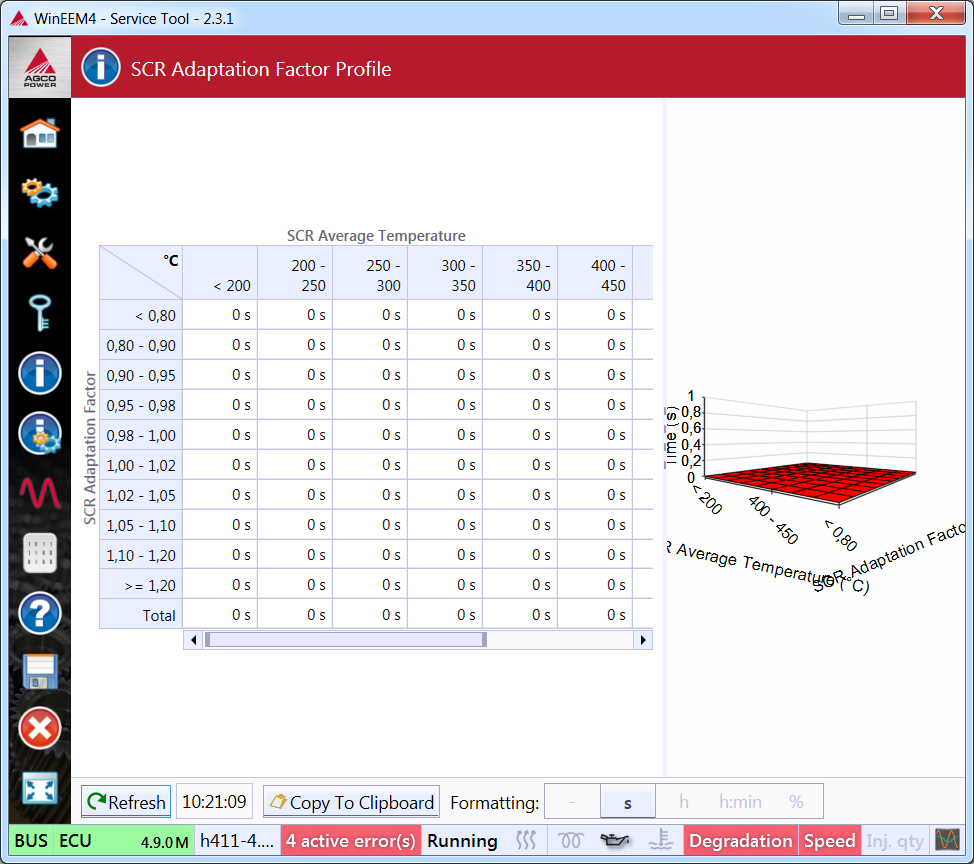 SCR adaptation factor profile displays how much time has been spent in each SCR adaptation factor & SCR average temperature range.