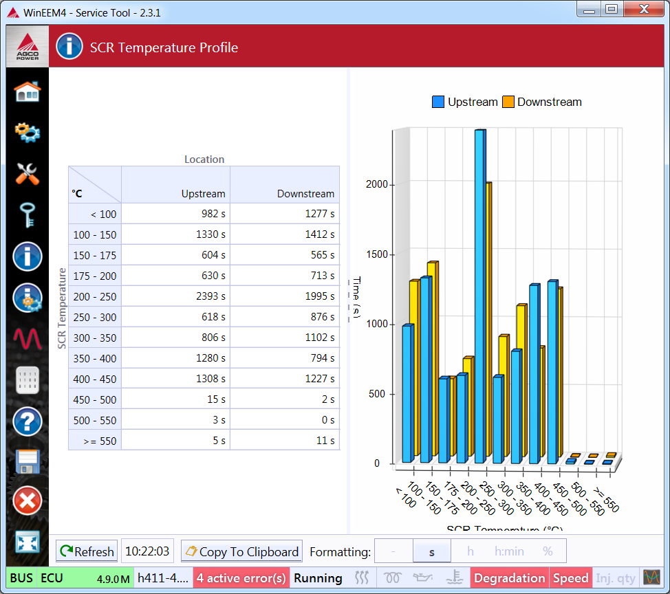 SCR temperature profile displays how long the SCR upstream and downstream have spent in each temperature range.