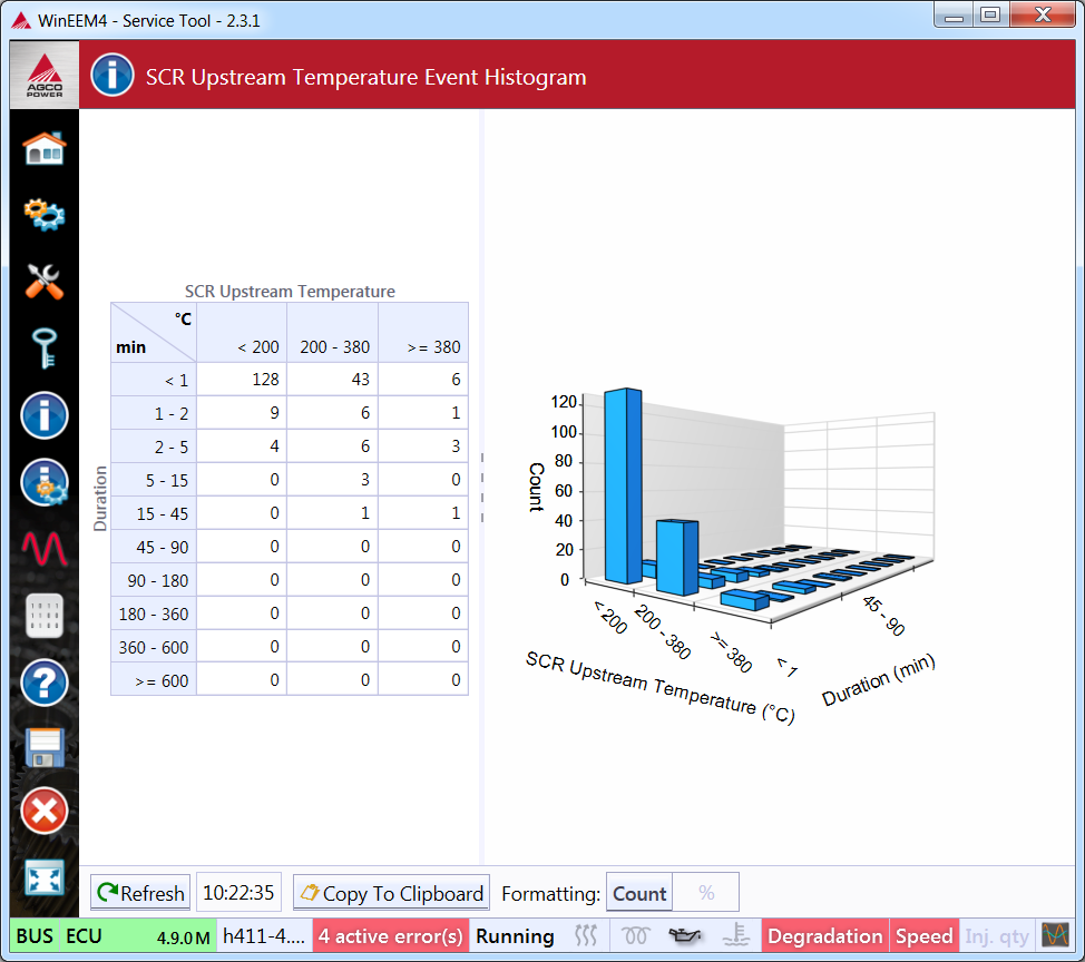SCR upstream temperature event histogram displays how many times the SCR upstream has been in each temperature range for a each duration range.