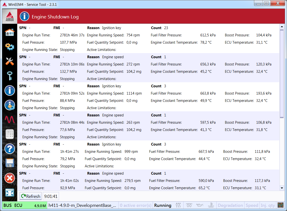 The EEM4 system has a log which tells the reason for the engine shutdown. The log is located in the eeprom, where 10 pcs of the latest shutdown reasons are stored. If the latest shutdown reason is same as the former, a new reason will not be written. Instead of a new reason, the former log counter is increased by 1. The maximum counter value is 255 pcs. After that a new log item with the same reason identifier will be introduced.