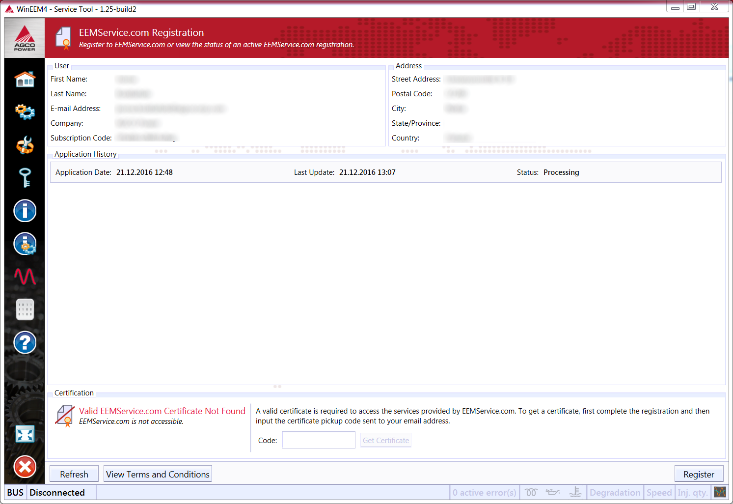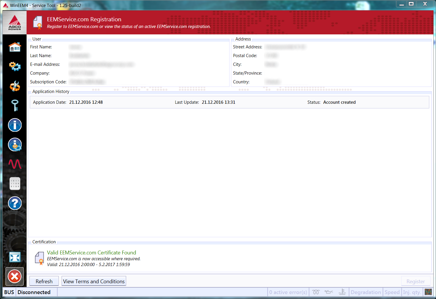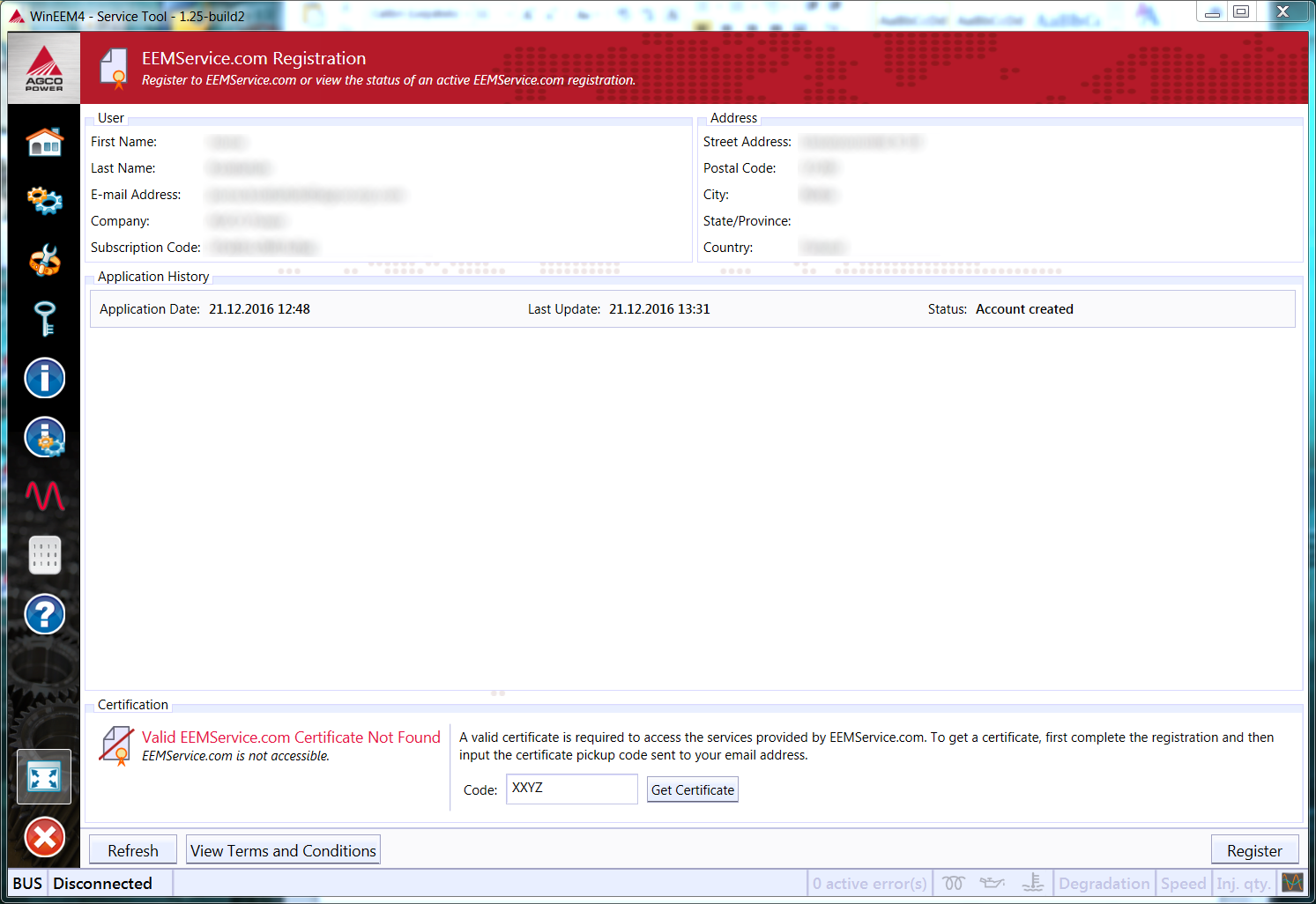 After EEMService.com administrators have approved your application, the application status in Service Tool should change to Account created (click Refresh to update the view). You will also receive an e-mail to the e-mail address you provided in your application. Enter the code given in the e-mail to the Code field in Service Tool and click Get Certificate.
