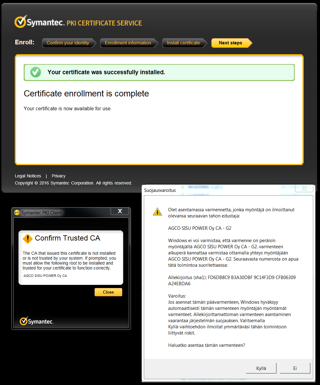 The certificate has now been downloaded and you are asked to confirm its installation. Before confirming the installation, check that the issuer is AGCO SISU POWER Oy CA – G2 and that the thumbprint is FD6DB8C9 B3A30DBF 9C14F3D9 CFB06309 A24EBDA6. If this is the case, select Yes / Kyllä in the security warning dialog to install the certificate.