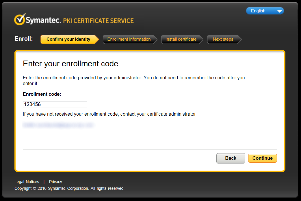 Internet Explorer opens into a site asking for your enrollment code. Enter the enrollment code given in the earlier e-mail message (the same message with the earlier code) and click Continue.