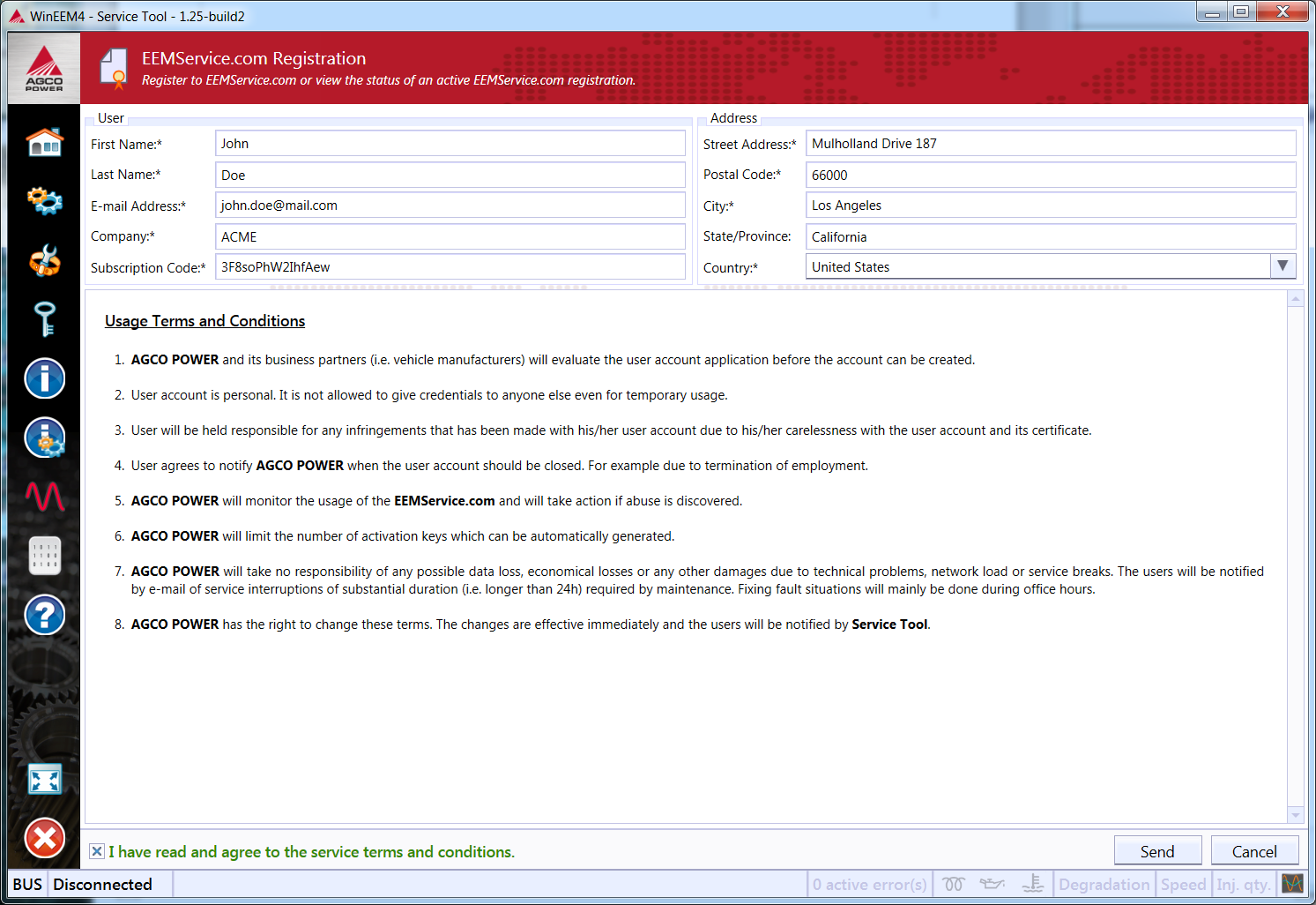 Fill-in the registration information. A valid e-mail address, which you can access, is needed for next steps in the registration process. Your OEM product support needs to provide you a subscription code before registration. State/Province field is optional. Read and agree to the usage terms and conditions and select Send.