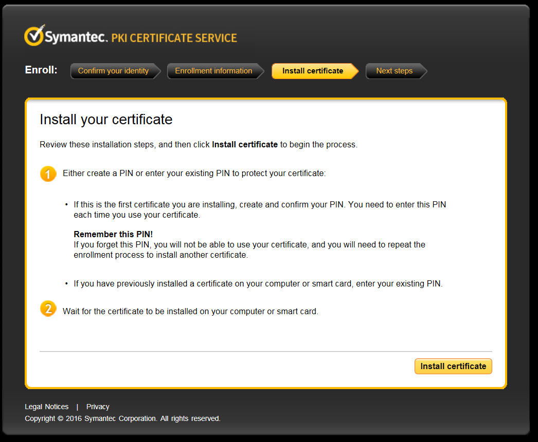 Read the certificate installation reminders and click Install certificate.