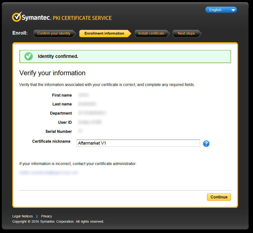 Verify that the information is correct. You may change the Certificate nickname if you wish. Click Continue.