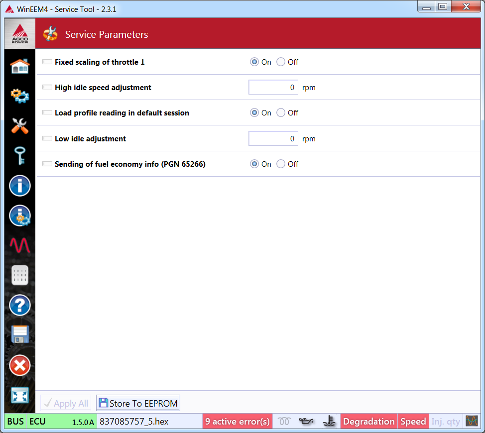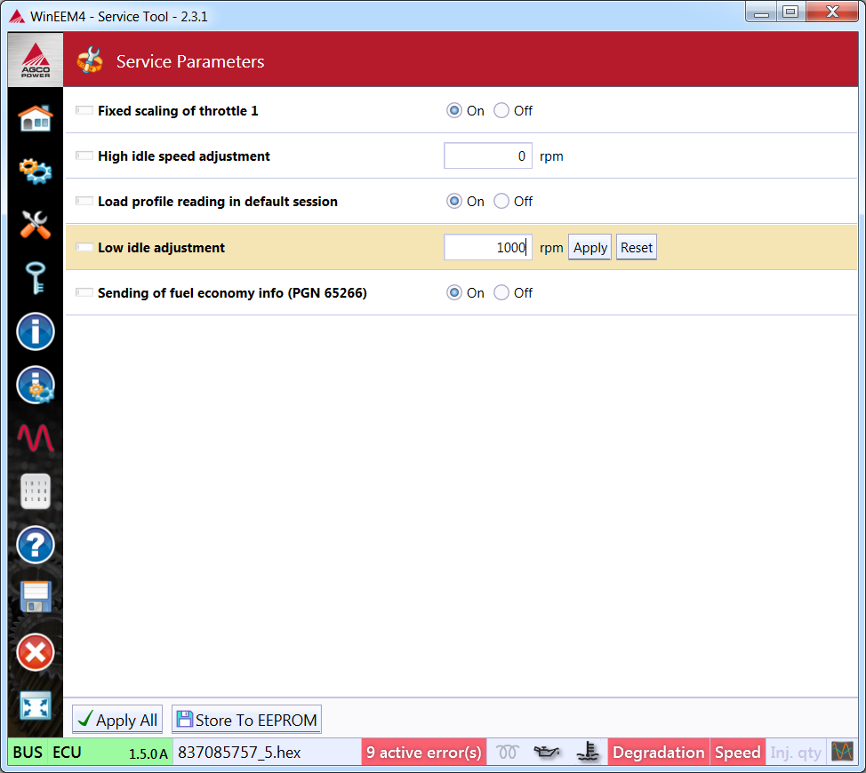 For example in this case it is possible to adjust 5 different service parameters. The adjusting of the service parameter is done in 2 phases. First the adjusted value is entered into the textbox. See figure Adjusting the low idle speed and click Apply. The second step is that the adjustment has to be stored to the permanent memory with the function Store To EEPROM. Note that you can repeat the first step many times to fine-tune the adjustment.